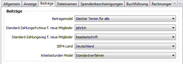 Die Standardwerte für den Zahlungsrhytmus und den Zahlungsweg bei der Speicherung neuer Mitglieder kann eingestellt werden.